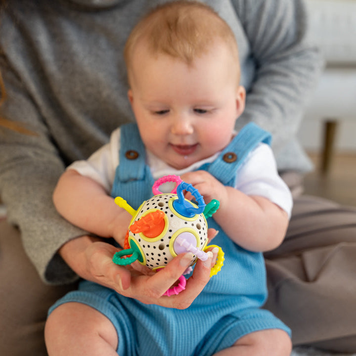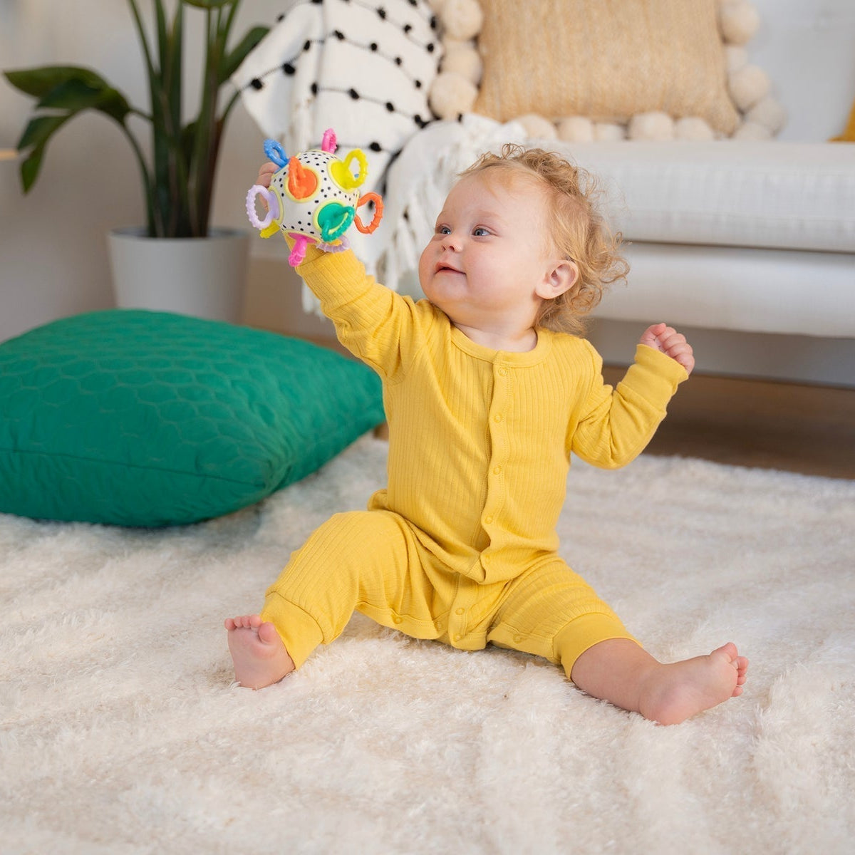 Cheer for a toy with soft plastic handles that click with every twist and a center ball filled with beads that rattles with every shake!
